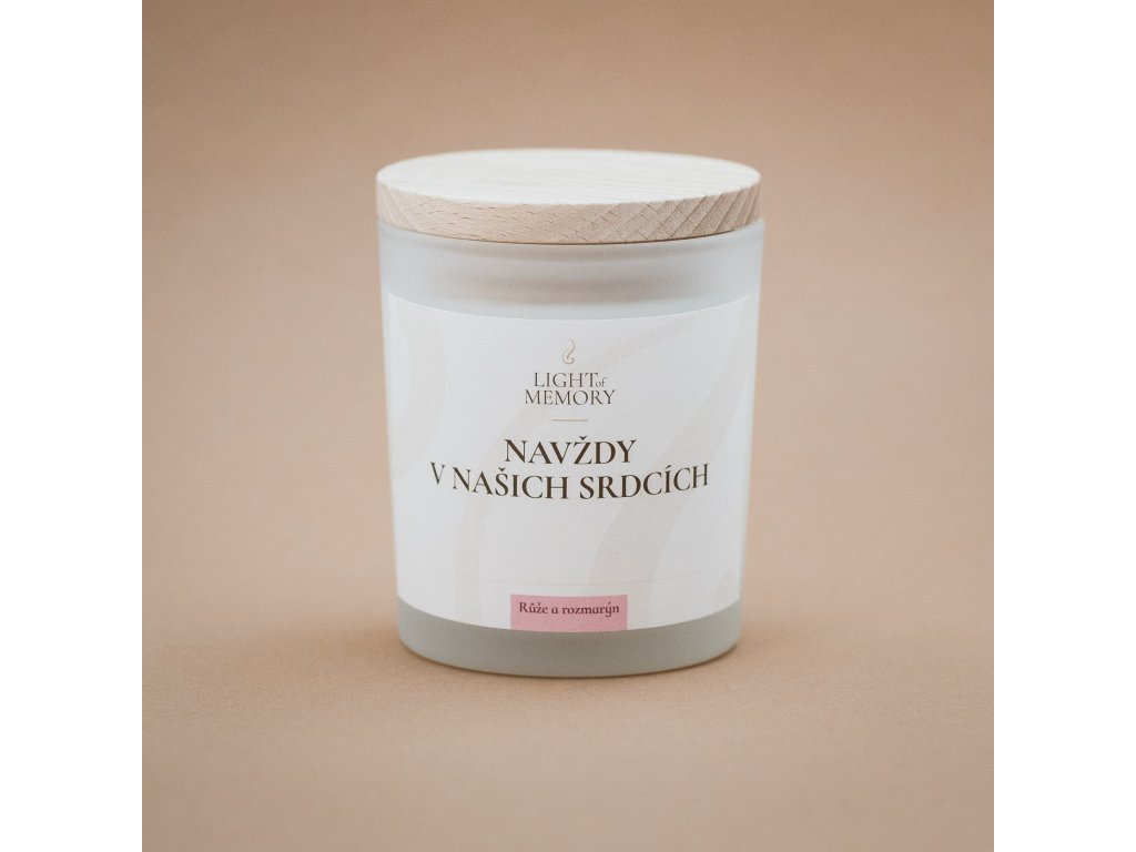 Růže je symbolem lásky a něhy a rozmarýn symbolem paměti a síly. Spojením těchto dvou vůní se vytváří harmonie mezi láskou a vzpomínkou. Svíčka ze 100% sojového vosku s bavlněným knotem hoří čistě a tiše, aby mohla být zapálena s úctou a klidem v srdci,a díky elegantnímu sklu působí decentně v každém interiéru i pietním prostoru.Pro chvíle, kdy se chceme zastavit a v tichosti vzpomenout.